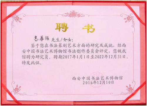 在活动仪式上,西安中国书法艺术博物馆被中国书法教育联盟授予“全国优秀书法教育单位”称号,赵九江主席向书法博物馆馆长庞任隆颁发铜牌。同时,书法博物馆书法创作委员会还在活动现场向馆内新聘任的高华强、李文卿、王浩礼等16名第二批研究员颁发了聘任证书,表彰了他们在书法研究创作方面的探索精神,鼓励研究员们今后踊跃参加书法进校园活动,把中国最优秀的书法文化送到最基层。