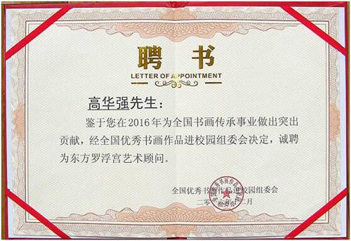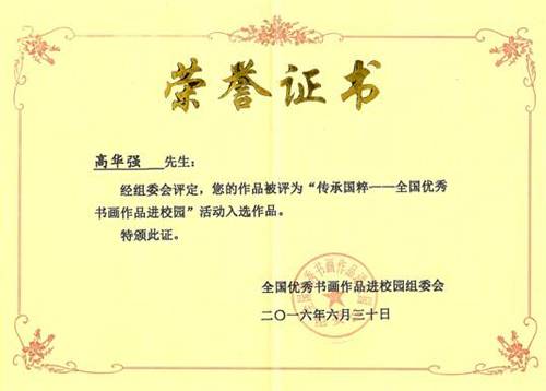 在2016年6月《中访网》艺术中心开展的全国优秀书画进校园活动中,高华强书法作品被全国优秀书画作品进校园组委会评为“传承国粹——全国优秀书画作品进校园”活动入选作品。2016年12月被全国优秀书画进校园组委会聘请为东方罗浮宫艺术顾问。