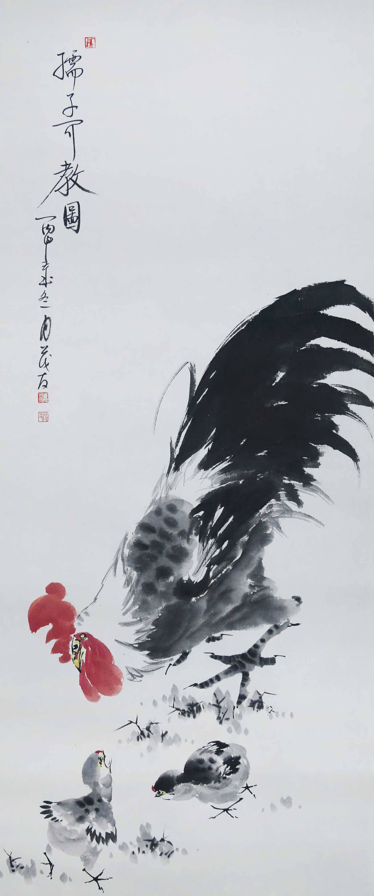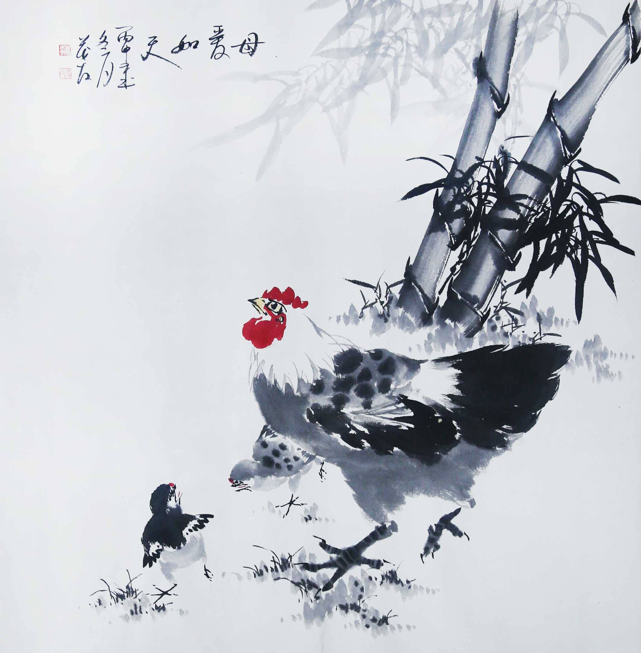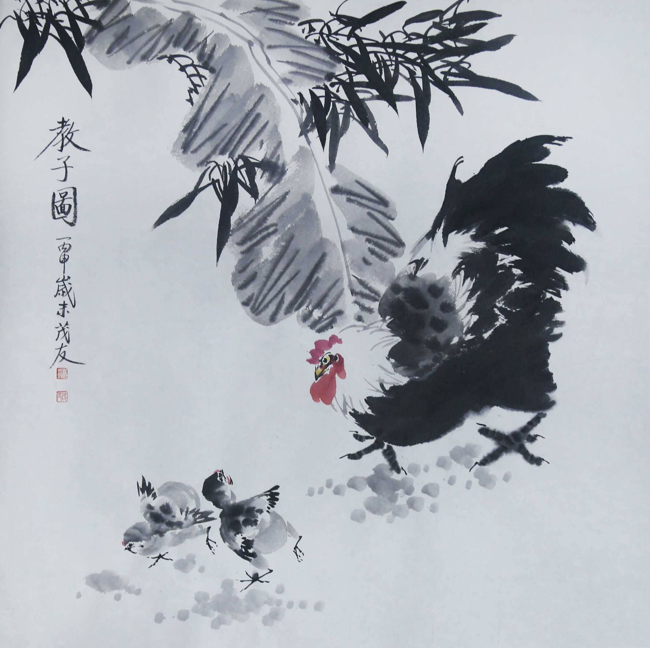 北师大中文系出身的蔡茂友,其画中带有文人情趣,画外流露着文人思想的绘画,讲究诗情画意,画中有诗,诗中有画,这是文人画一致的追求,画中往往重意重简,借描绘目之所及的自然景物写心灵感受。文人作画,知画之为物。是性灵者也,思想者也,活动者也。在他的笔下:母鸡对儿女的慈祥仁爱,雄鸡对家族的尽责守护,相夫教子和谐相处,尤其是雄鸡的美姿伟态,和生活中的男子汉大丈夫气魄,使他深感鸡为德禽、颇有人情味。在他的《孺子可教图》作品中,抓住雄鸡俯下身子与小鸡交流,互相依偎,惟妙惟肖,准确地把握物象的动态细节,展现出以老教幼的“人生写照”。