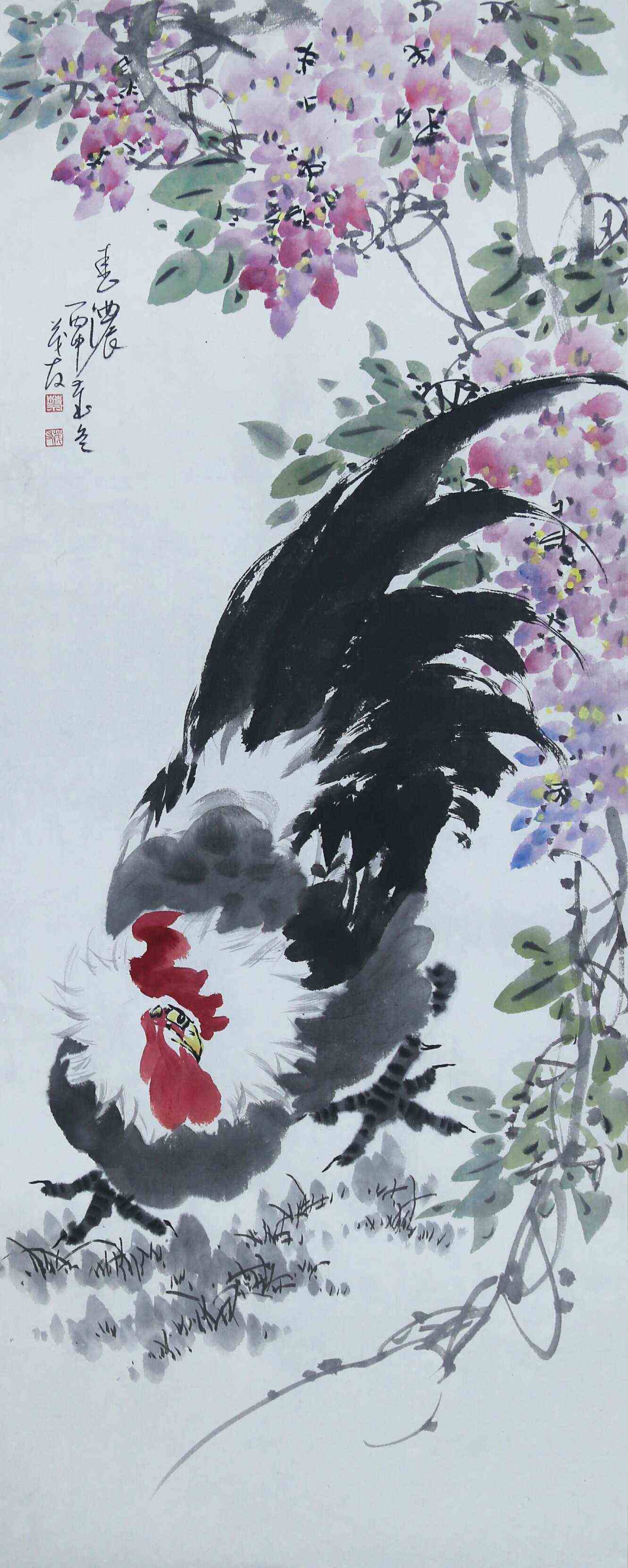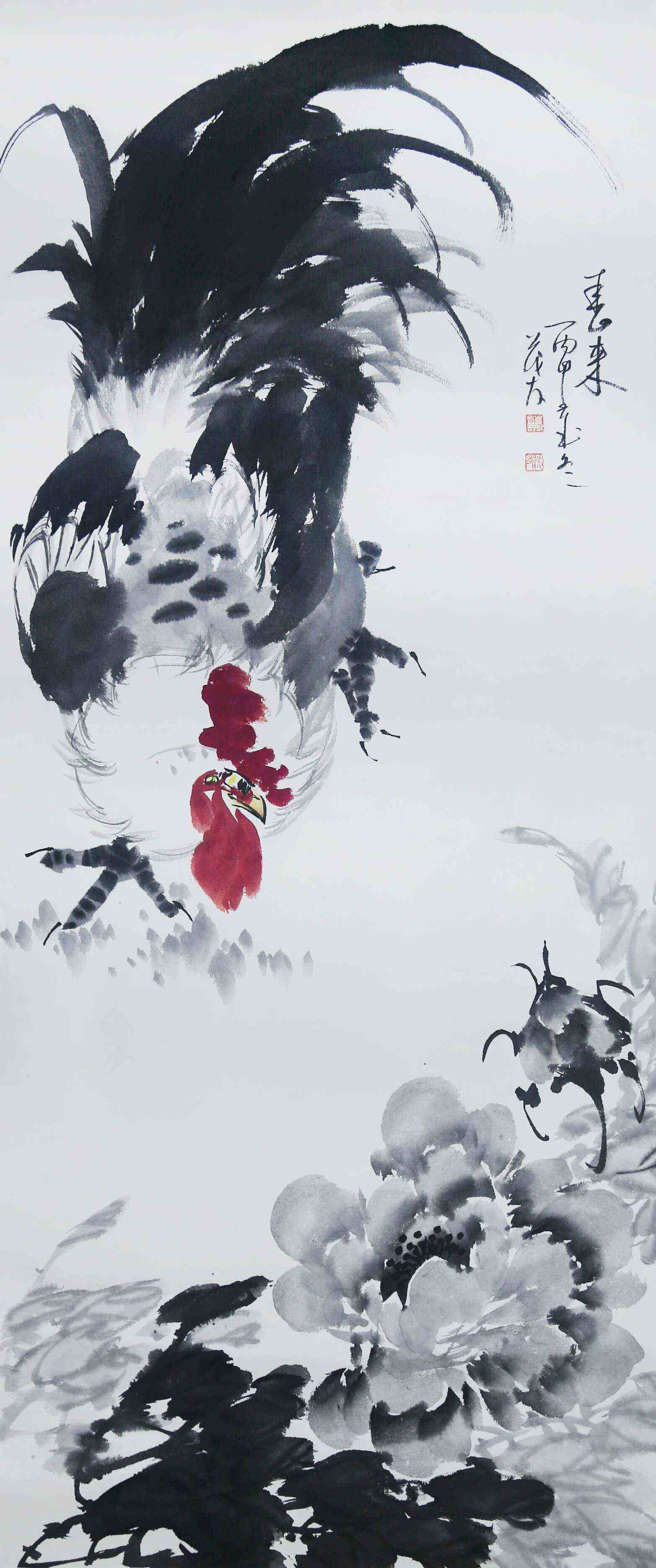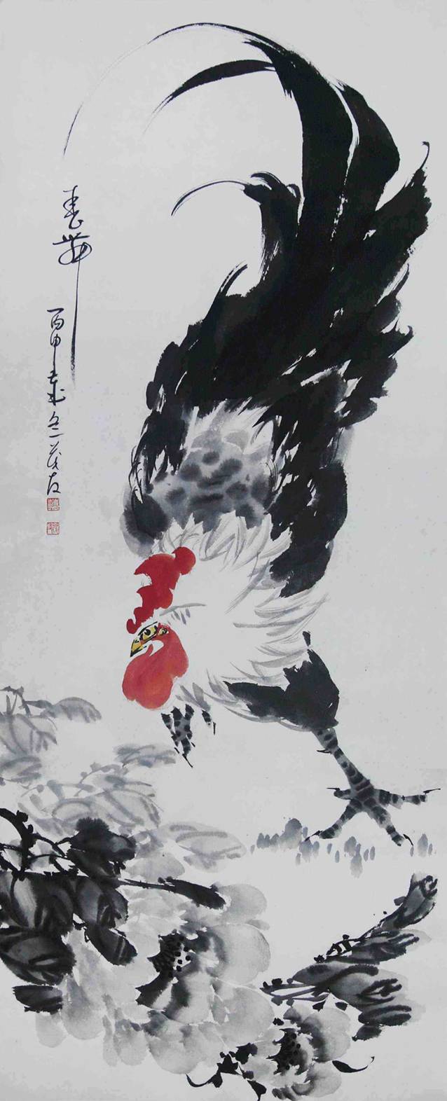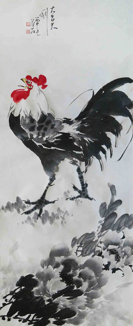 如他的作品《春来》,画雄鸡披风(颈羽),淡墨勾之,惜墨如金;画翅膀,以重淡墨绘之,适当留白,淋漓酣畅,浓淡相宜,加之以方笔浓墨勾勒轮廓,充分展现羽毛之质感;画鸡嘴,小巧尖锐,墨色圆润;画鸡冠,如喷薄跃动的火炬,笔法灵活,突出火红的鸡冠细腻自然,高耸劲健;画眼睛,黄色染之,以较干爽的浓墨点睛,目光灼灼生辉,这是雄鸡传神写照的最精彩的一笔;画尾巴,以重墨或浓墨为主,放笔直写,潇洒而劲拔;画腿爪,半侧身独立,与头、胸形成对立统一,既稳住了重心,又极具金鸡独立的动感和险势,这是他画雄鸡的又一巧妙之笔。再根据画面需要,发挥其画水墨牡丹的特长,雄鸡与牡丹上下相互顾盼,配以简约的背景,补充完善画面,烘托主体。或再有搭配清新自然的竹子、摇曳的紫藤、丰满的蕉叶等等,使之画面如充满情趣。概言之,是“用情笔墨之中,放怀笔墨之外”(石涛语),以意为主,让气韵自出;将心意挥洒得淋漓尽致。