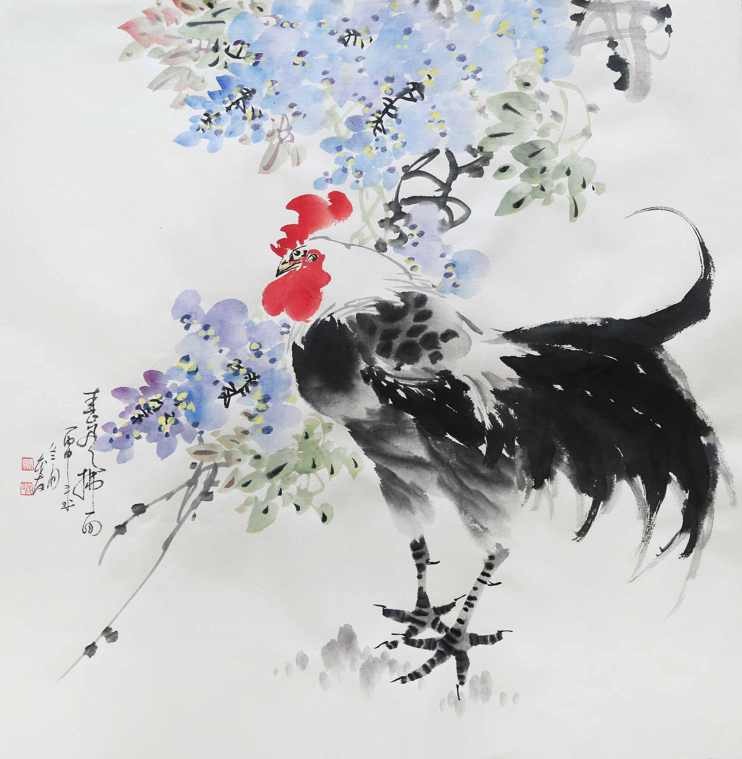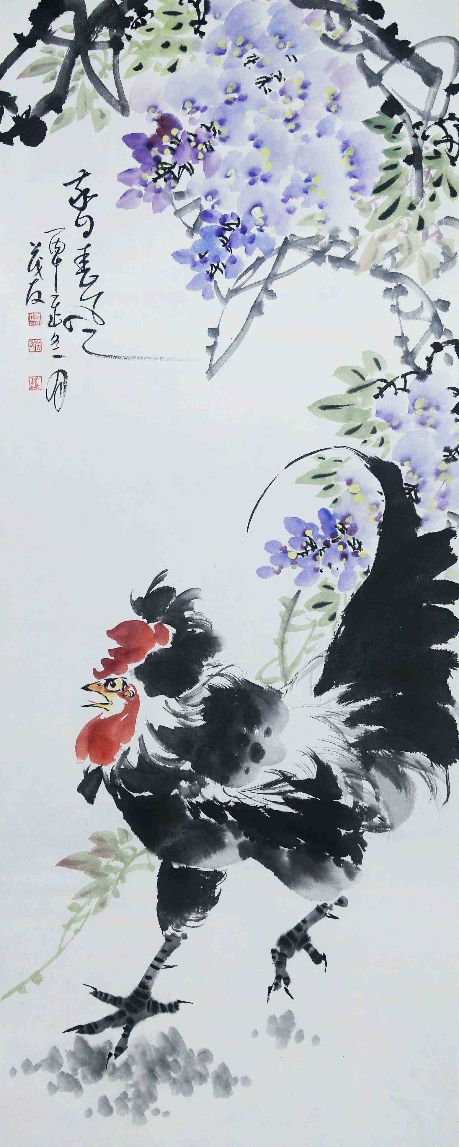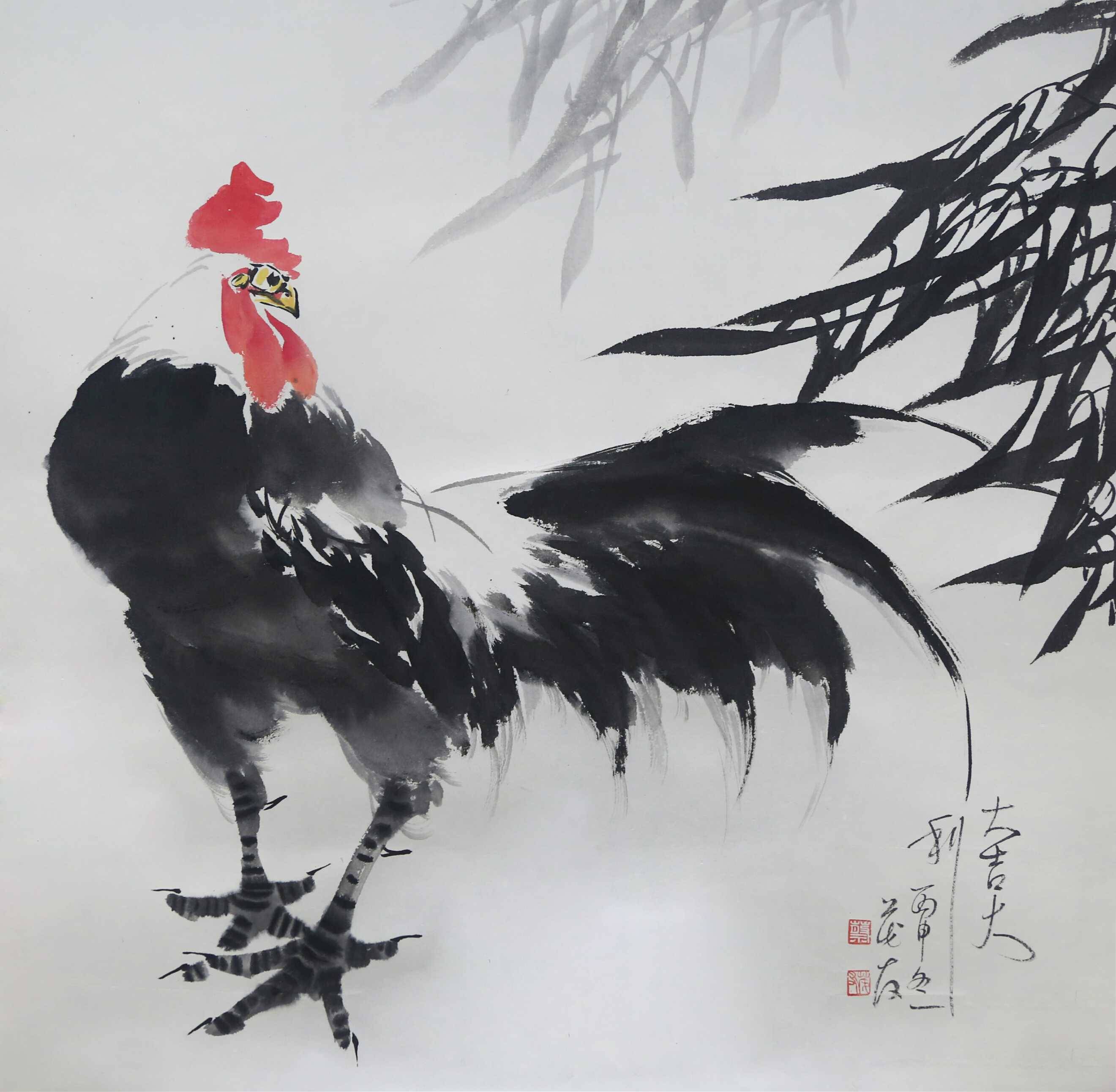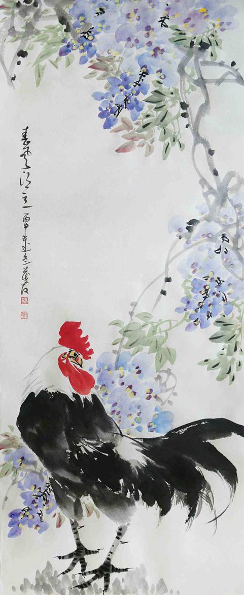 如他的作品《春来》,画雄鸡披风(颈羽),淡墨勾之,惜墨如金;画翅膀,以重淡墨绘之,适当留白,淋漓酣畅,浓淡相宜,加之以方笔浓墨勾勒轮廓,充分展现羽毛之质感;画鸡嘴,小巧尖锐,墨色圆润;画鸡冠,如喷薄跃动的火炬,笔法灵活,突出火红的鸡冠细腻自然,高耸劲健;画眼睛,黄色染之,以较干爽的浓墨点睛,目光灼灼生辉,这是雄鸡传神写照的最精彩的一笔;画尾巴,以重墨或浓墨为主,放笔直写,潇洒而劲拔;画腿爪,半侧身独立,与头、胸形成对立统一,既稳住了重心,又极具金鸡独立的动感和险势,这是他画雄鸡的又一巧妙之笔。再根据画面需要,发挥其画水墨牡丹的特长,雄鸡与牡丹上下相互顾盼,配以简约的背景,补充完善画面,烘托主体。或再有搭配清新自然的竹子、摇曳的紫藤、丰满的蕉叶等等,使之画面如充满情趣。概言之,是“用情笔墨之中,放怀笔墨之外”(石涛语),以意为主,让气韵自出;将心意挥洒得淋漓尽致。