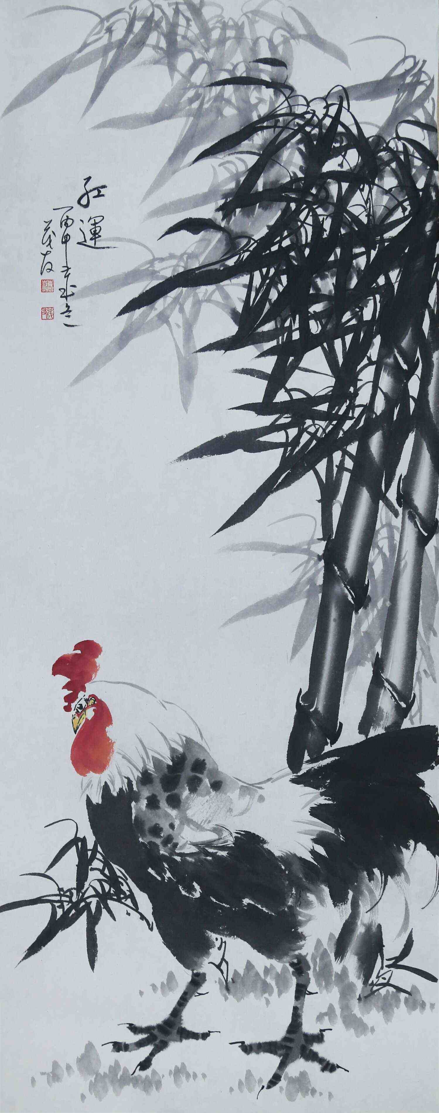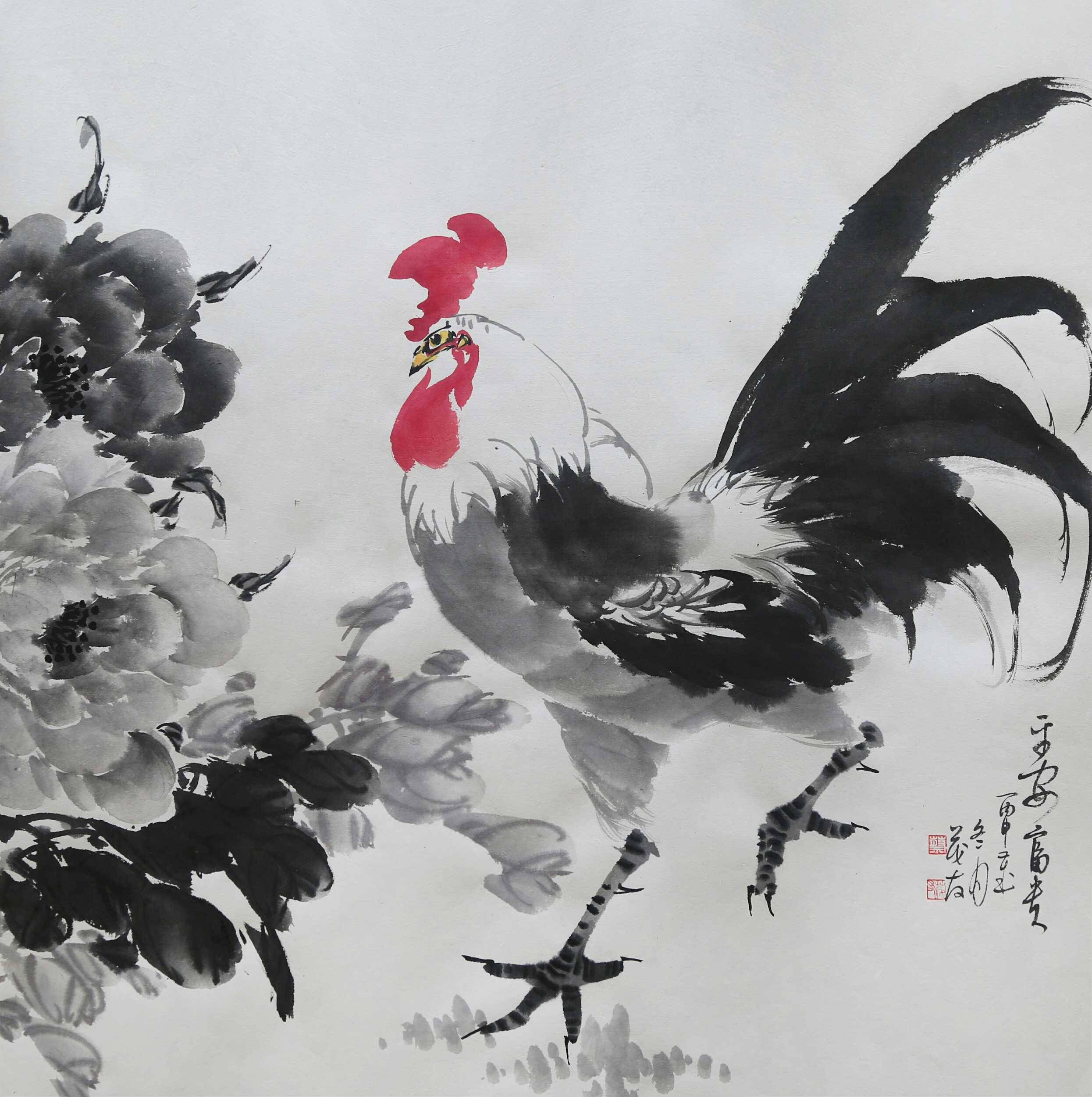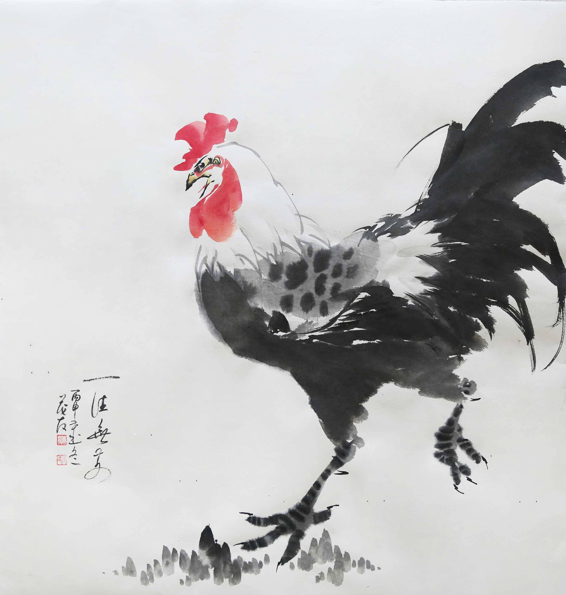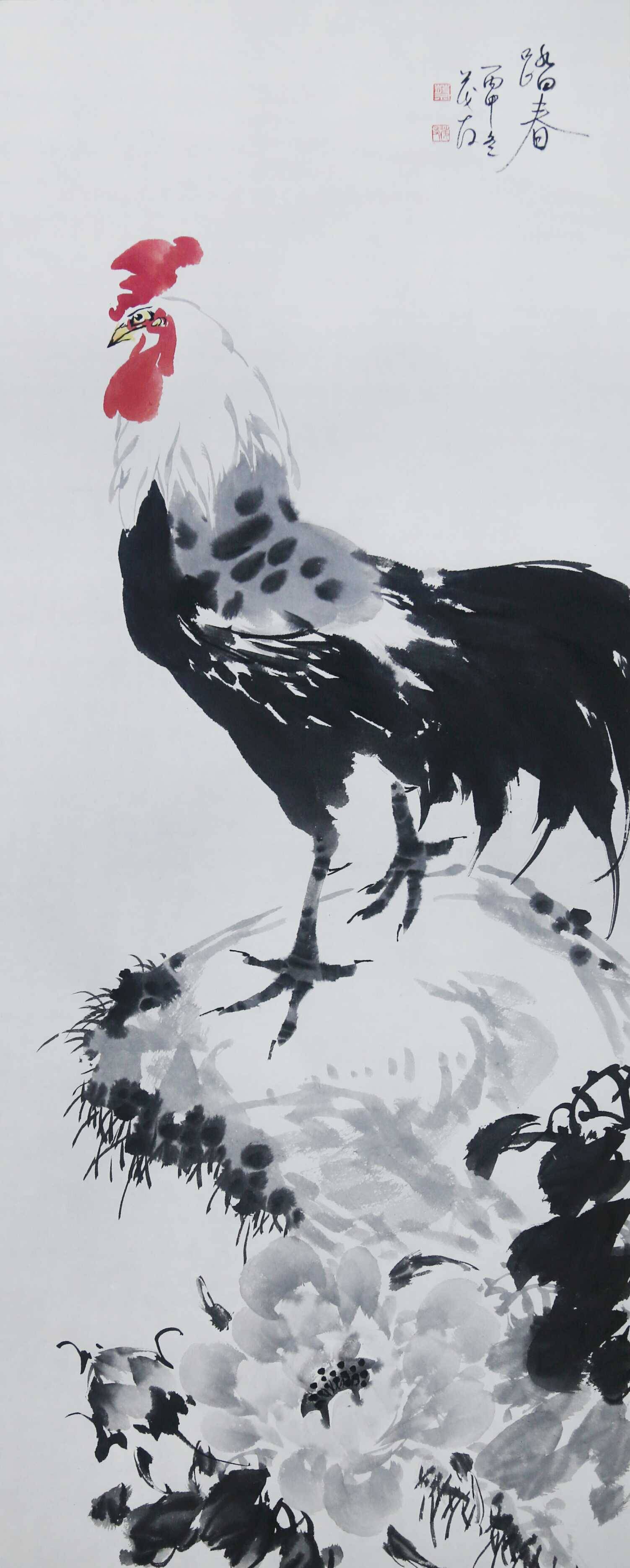 如他的作品《春来》,画雄鸡披风(颈羽),淡墨勾之,惜墨如金;画翅膀,以重淡墨绘之,适当留白,淋漓酣畅,浓淡相宜,加之以方笔浓墨勾勒轮廓,充分展现羽毛之质感;画鸡嘴,小巧尖锐,墨色圆润;画鸡冠,如喷薄跃动的火炬,笔法灵活,突出火红的鸡冠细腻自然,高耸劲健;画眼睛,黄色染之,以较干爽的浓墨点睛,目光灼灼生辉,这是雄鸡传神写照的最精彩的一笔;画尾巴,以重墨或浓墨为主,放笔直写,潇洒而劲拔;画腿爪,半侧身独立,与头、胸形成对立统一,既稳住了重心,又极具金鸡独立的动感和险势,这是他画雄鸡的又一巧妙之笔。再根据画面需要,发挥其画水墨牡丹的特长,雄鸡与牡丹上下相互顾盼,配以简约的背景,补充完善画面,烘托主体。或再有搭配清新自然的竹子、摇曳的紫藤、丰满的蕉叶等等,使之画面如充满情趣。概言之,是“用情笔墨之中,放怀笔墨之外”(石涛语),以意为主,让气韵自出;将心意挥洒得淋漓尽致。