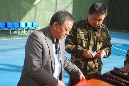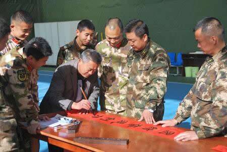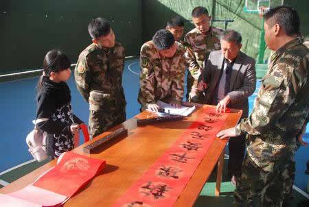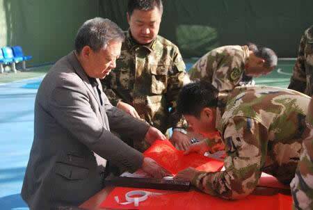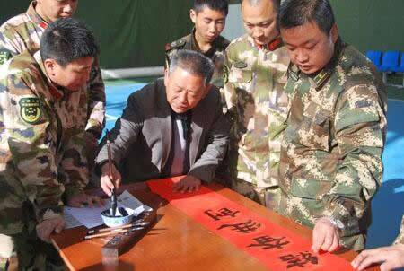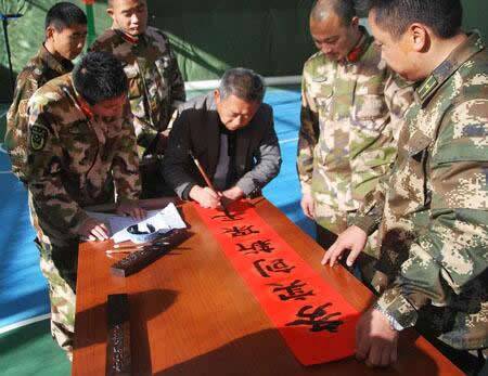 2017年春节放假前一天,人们都在忙着准备过年,书法家蒋斗贵先生顾不上自己的忙碌,应当地驻军的邀请,欣然前往参加迎新春学习书法活动。军营气氛非常热闹,战士们以最饱满的热情和热烈的掌声欢迎蒋先生百忙之中前来军营和他们畅谈书法心得。他用自己的行动带动了战士们对书法的热爱,蒋先生很亲和的和战士们聊书法聊艺术。他从用笔、用墨、用纸到书写技巧,讲得生动具体,有条不紊,并即兴写下了“团结奋进创佳绩再接再厉,务实创新保平安无怨无悔” 的春联,作为对战士们的新春祝福和鼓励。蒋先生平易近人的大家风范,言谈用词的渊薄学识,以及娴熟书写的艺术技巧,给官兵们留下了深刻印象并受到热情拥戴。也为艺术传承走进军营开辟了一片新天地。蒋先生高兴地说“书法是我国的国粹,普及书法是一种责任。此行与战士们同欢,不仅是书艺的交流传承,更是文化的激励与延伸,我乐此不疲。”蒋先生希望中国的书法艺术能在每一个领域里都能灿烂辉煌,源远流长,也希望通过自己的努力为中国书法作出更多的贡献。
