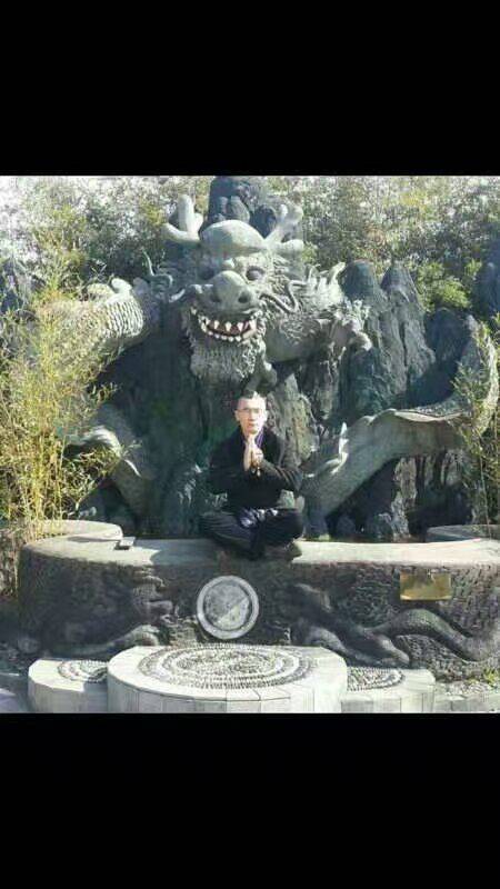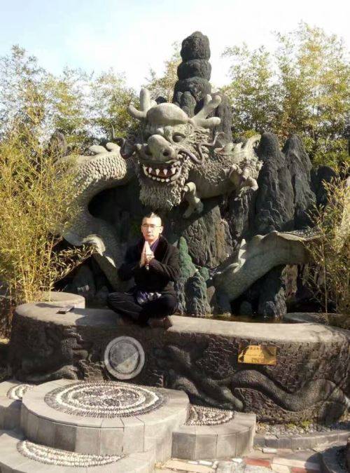宏泰院长颇有兴致的说,他从北京返沪回院见到这幅龙字后,从心里认定是为他率领的龙文化定身打造,而小年之日的上午应赴上海青龙古寺,见到古青龙实景后莫不惊诧且无不振奋,其古青龙实景与笔者所书之《龙》形天意酷似,宏泰院长襟不住在古青龙处正中间恭蹲打坐拍照掠影(见图三图四)。