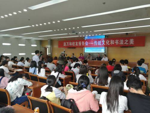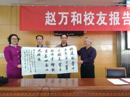 5月24日下午,我校首届校友返校日/周系列活动之“校友大讲堂”——赵万和校友报告会在逸夫图书馆五楼报告厅举行。著名书法家赵万和校友作了题为“传统文化与书法之美”的主题报告。党委常委、校长助理、组织部部长吴胜红,校友事务处副处长颜艳燕和近百名师生、校友代表参加报告会。报告会由吴胜红部长主持。