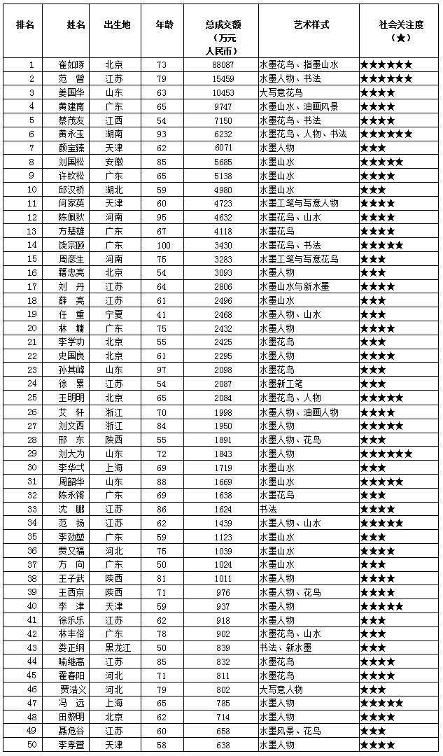 当今中国艺术界形成了多元化、多样式的格局。面对这种艺术争鸣的时代,每种艺术观念都是平行发展的。如何保持水墨艺术的生命力,是水墨艺术家需要思考的问题。正因为他们一直以来对中国传统文化的传承和对当代艺术理念的探索,在受到整体市场稳步增长影响的今年,其水墨作品倍受欢迎。通过各种数据的遴选,榜单显示前十位水墨艺术家如下: