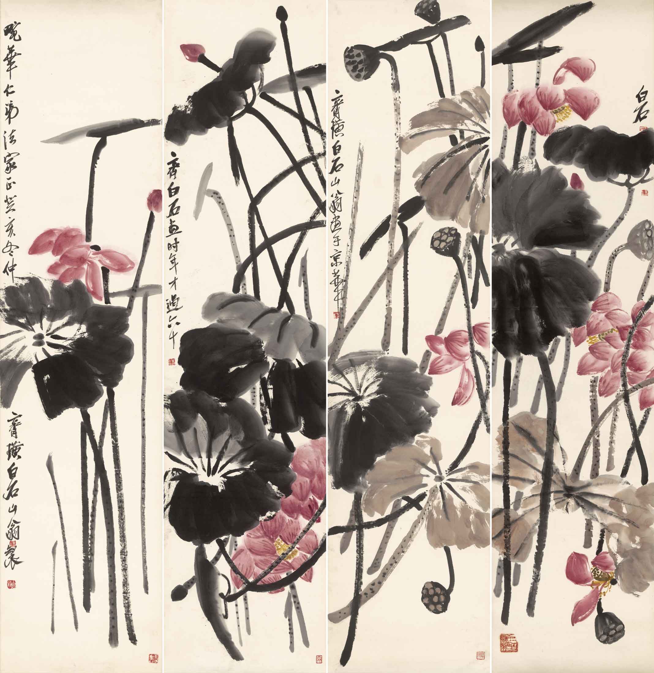 再到齐白石笔下的荷,无论是秋荷、残荷、还是缀以虫鸟的荷趣图,荷花的形象皆挺拔而厚重,苍劲而清健。再如张大千常作小品荷花,但也有许多壮观的大幅荷花作品,荷花通是朱红色,然后用泥金勾勒出轮廓线和花瓣上的细脉,使整朵荷花都突显出来,这种“金丝荷花”,意境深远。