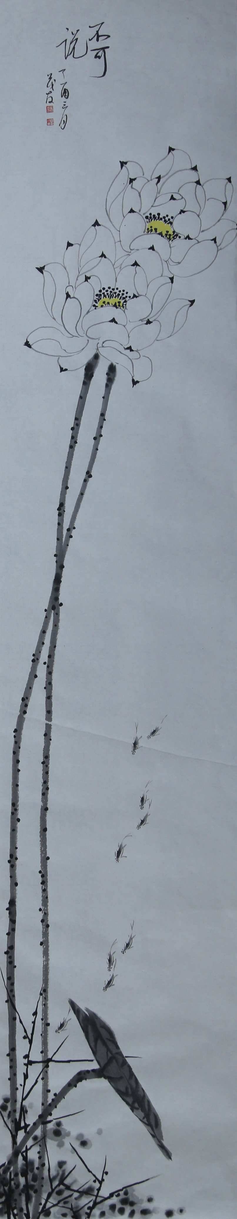 他的作品《不可说》,为竖构图,以斜角取势,画面追求强化结构张力,吸取了西方现代构成因素,但本质上仍然是民族传统二维平面章法原理的延伸,在他的张力结构中,还蕴藏着禅机,这是蔡茂友在章法上的一个突破。其一画双钩荷花,用笔若紧若松,笔笔中锋,花瓣皆不封合,气口充盈,笔势多变,线条与块面交织;整体格调简洁,但笔致却倾向于柔和温润;物象多简化、纯化。写出了荷花高雅绝俗的逸气、清气。笔法有张有弛、有快有慢,一展荷之亭亭玉立,开朗而舒展。水是一切生命的源泉,荷花也因水而生,画家将水为空白,再以虚为主,以空灵为上。荷梗之下,群鱼浮现,空气流动,巧妙创造出了心灵荷花意象。