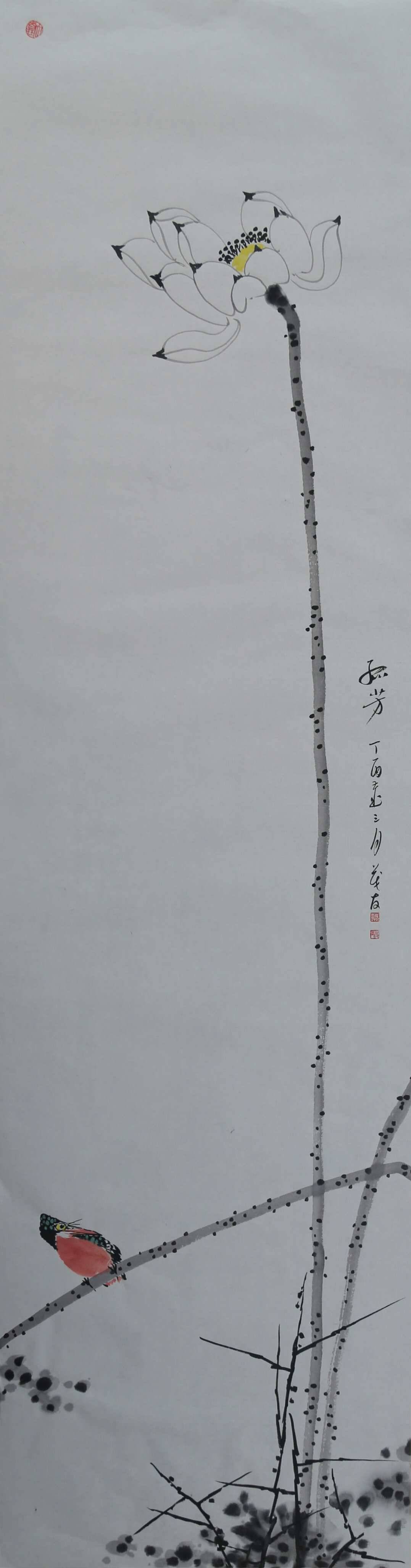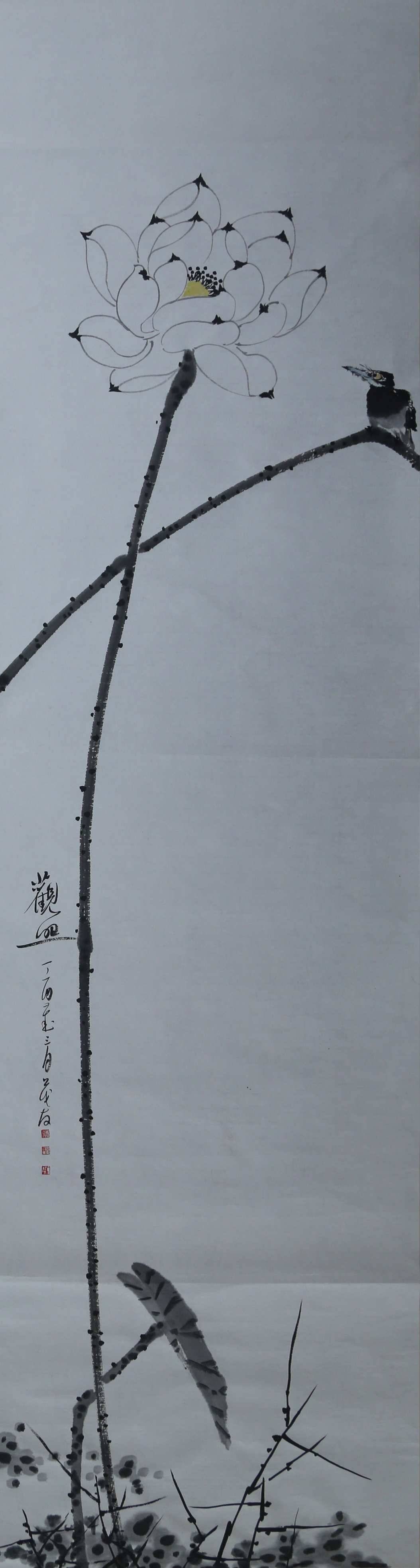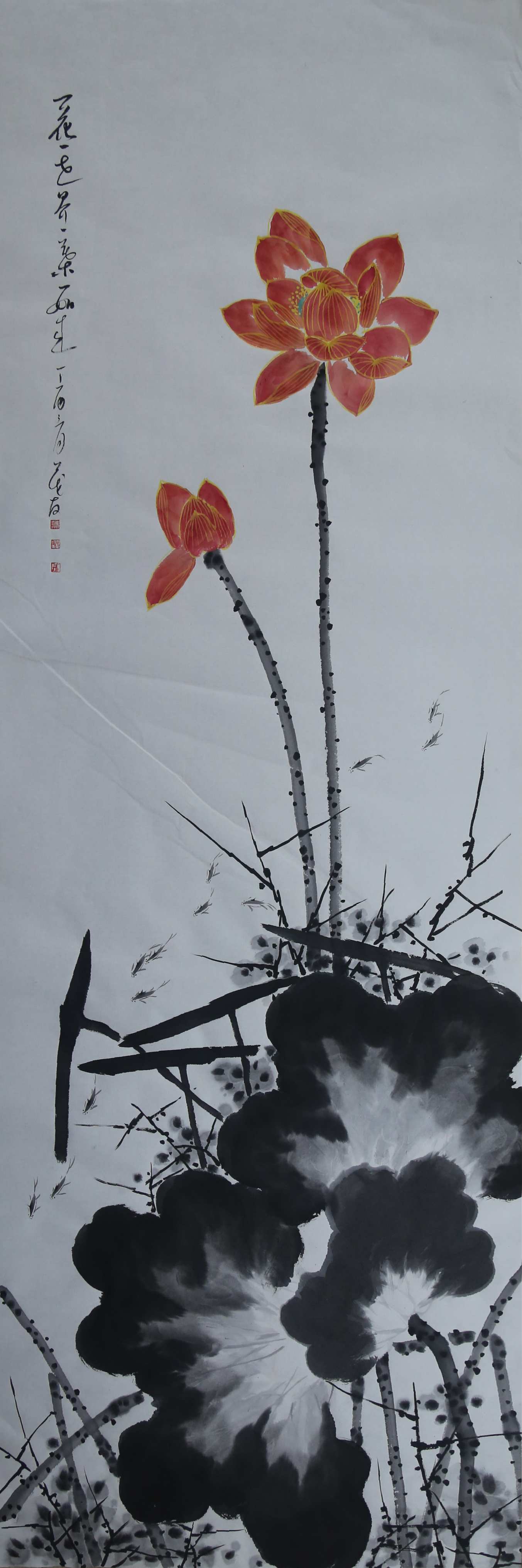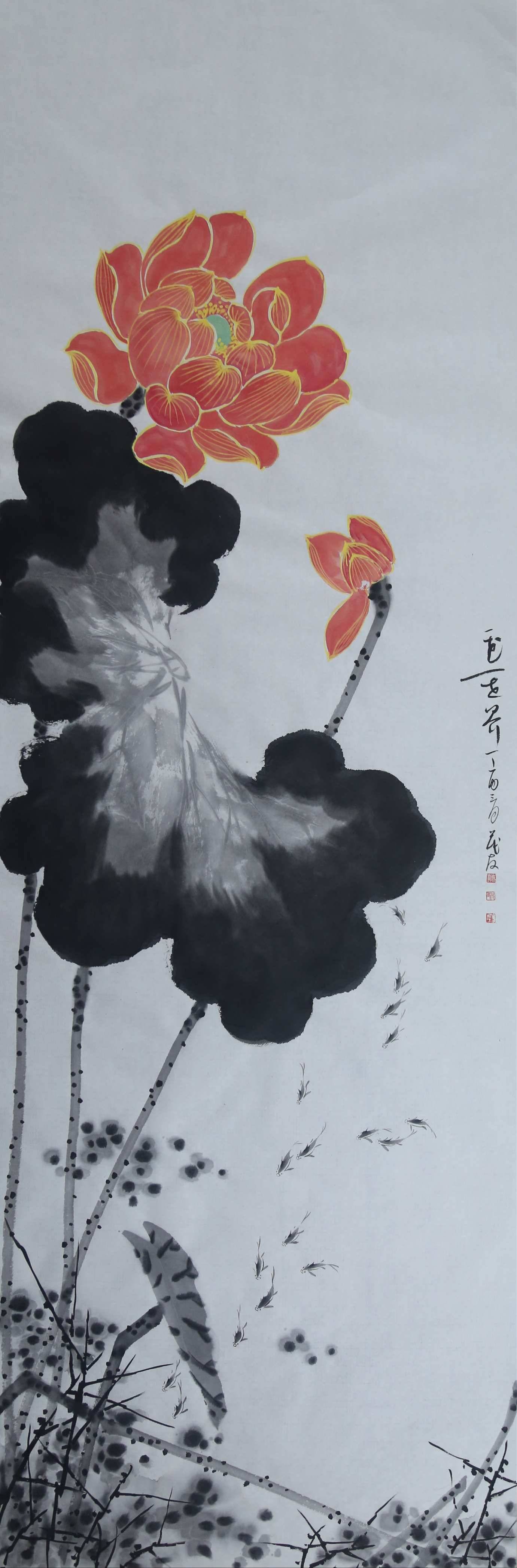 荷花是我国古典文学重要题材。唐代诗人王昌龄《采莲曲》云:“荷叶罗裙一色裁,芙蓉向脸两边开。乱入池中看不见,闻歌始觉有人来。”把采莲女撷取碧池莲花的情景,描绘成一幅动人的图画。画家创作,缘于心生,更在于画家悟性。北京师范大学中文系毕业的蔡茂友对于从诗经到楚辞,从曹植到王勃,从陆游到周敦颐,从佛家经典到艺术审美,赋予荷花众多的象征意义与美好品格有着深入研究,在他的作品《一花一世界》,两朵朱红荷花,泥金勾勒,墨色浓淡,相宜且虚实有度。他为荷花融诗意创画境,微观体察“接天莲叶无穷碧,映日荷花别样红”的宏观景色,色调鲜丽,高贵典雅,而线条挺拔的荷杆聚散错落,直耸画面,即使硕大舒展的荷叶也未见摇曳,似乎风已静,荷叶也趋于空寂,一种禅意油然而生,更彰显出当代文人水墨画的精神情怀。