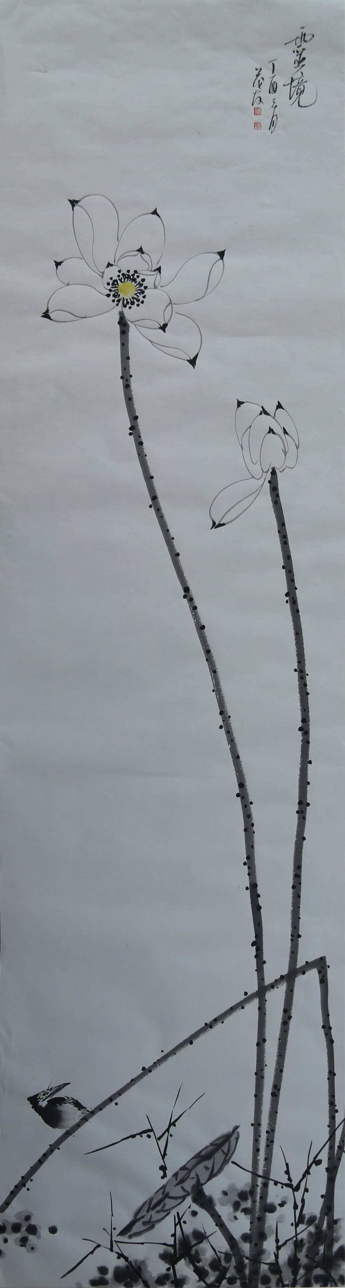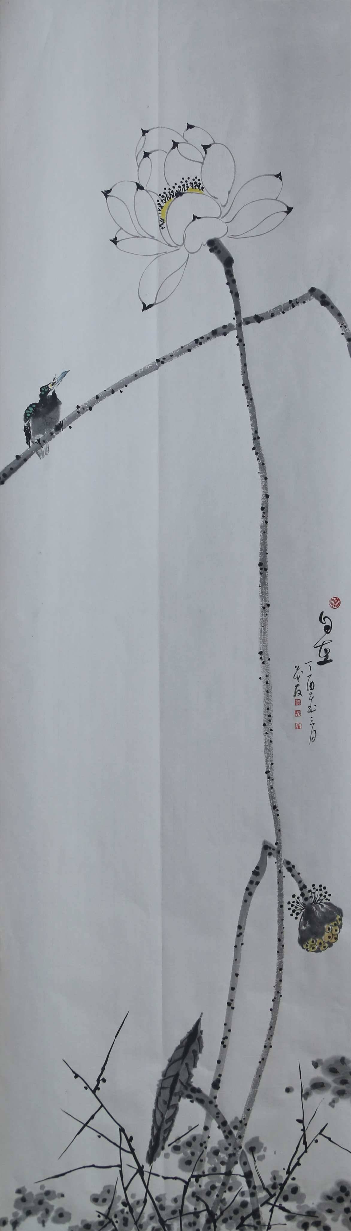 蔡茂友的水墨荷花多为洁白,源自唐李白“清水出芙蓉,天然去雕饰”的称颂,到宋周敦颐“出淤泥而不染,濯清莲而不妖”的赞美,尤其是“香远溢清,亭亭茎直,可远观而不可亵玩”的赞美,其圣洁、宁静、清贵的形象呼之欲出。他的作品《自在》,荷枝简洁交叉,一洁白荷花向上斜出,一只翠鸟停驻左方,双爪紧握荷茎,神情专注,为空静的画面平添意趣,一显清荷生命,水墨禅境。其实,学过画荷的人部知道,画荷最难画的是荷花。在画面的处理上,如布局不佳易单调,在笔法的运用上,如笔力功夫不深,易浮现流俗,在意境的造化上,其越简越难。他充分发挥自己在书法方面创作的优势,并研究在“写与画”两种艺术创作形式进行互相转换,虽然它不表现具体的图像,但在写的过程中所留下的看似抽象的线条与图形本来就是“具万象于一象”的,它那点线面之间的各种组合关系,构成了各具形态,继而具有绘画的特征。他以书法之笔写荷枝出撇叶,绘偃仰起伏、前后穿插之态,有条不紊地表现出荷花在清风中飘举摇曳的情状,尤其叶梢提笔一转,将风荷潇洒婆娑尽现纸上,由此可见,他的水墨荷花与其书法具有同样的美学风格,这是蔡茂友画荷的显著特征。