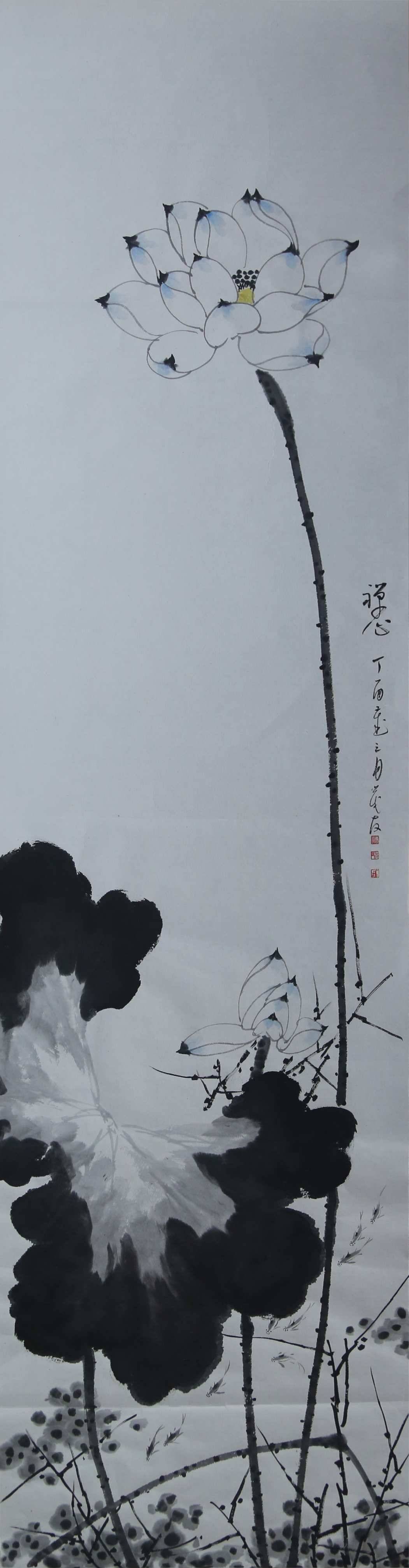 中国荷文化积淀丰厚,蔡茂友以当代人的视野重新审视和思考荷之美,进入了探究人生价值与生命状态的新境界。他在笔墨语言形态上进行了新的探索和追求,追求书法笔意,水墨意境,结构张力,这样的艺术意蕴就使作品的审美内涵显得更为空灵,更有气韵,由此而产生禅化的意境。这种画家写意化境,恰恰带给我们妙悟自然的禅意,更包涵着对于大千世界的深刻感悟,其荷之道,自然显现出难得的墨荷禅境。