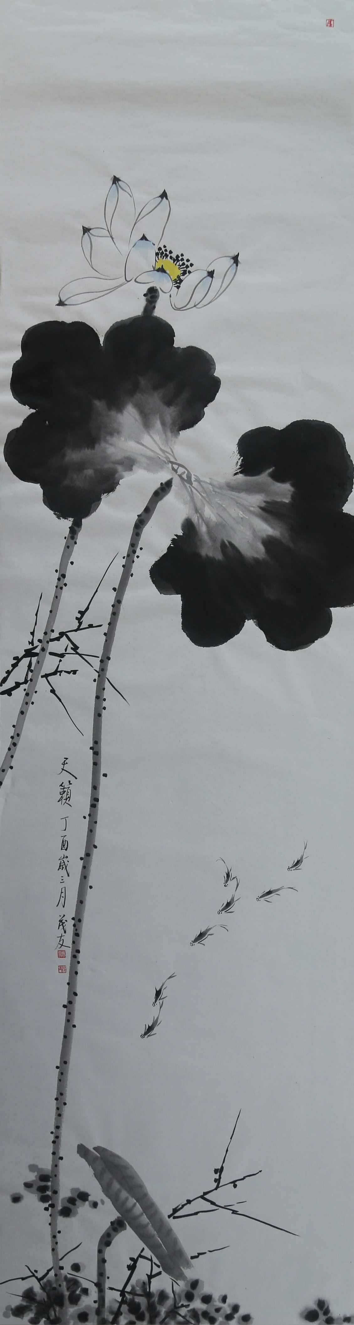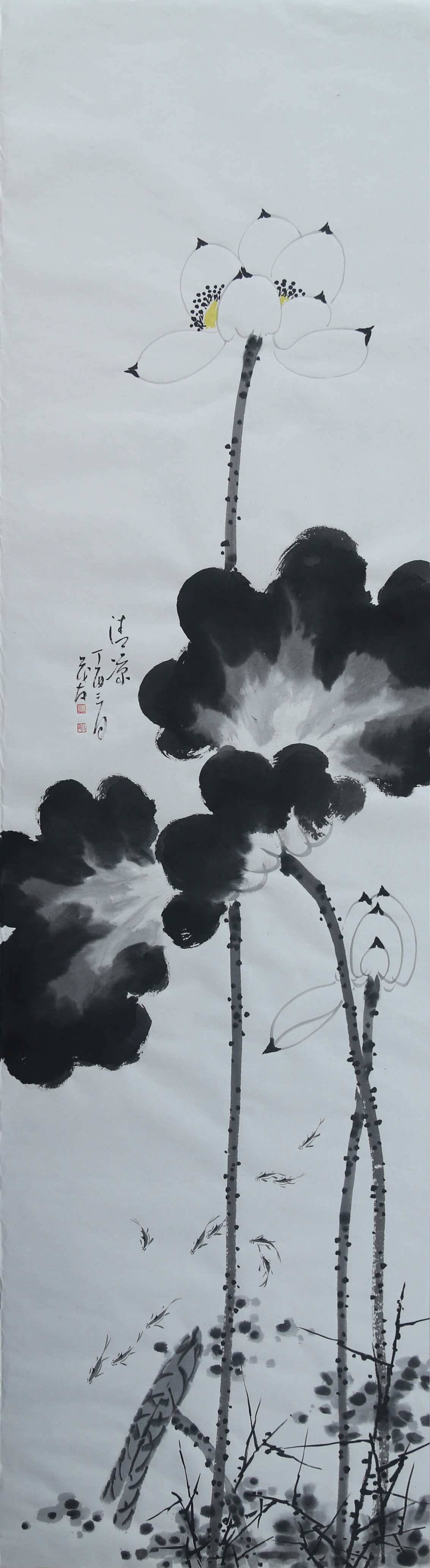 在蔡茂友的水墨荷园里,一花一世界,亭亭出水,从一朵朵到一枝枝,从少到多,由远及近映入你的眼帘;或是一枝独秀临风摇曳的荷花斜出几何形构图的画面,流露出别样气息;或是一朵含苞欲放的蒸萏,与气韵生动,荷叶掩映成趣;或是笔法粗中有细,生拙而不霸悍,有毛笔画难到之意,雅静而非雅致小巧,有笔墨而无笔墨痕;或是多以展现春荷清纯如笑,夏荷灿烂如霞,秋水之荷,则释放出俊逸不屈的风骨美,壮烈而圣洁;或是一缕荷香,透画而来,笔点墨染,叶浓花淡。白荷清新淡雅,荷叶层层渲染,描绘阴阳向背。婷婷玉立于荷塘中,意率笔纵,机趣自然,逐入禅境。
