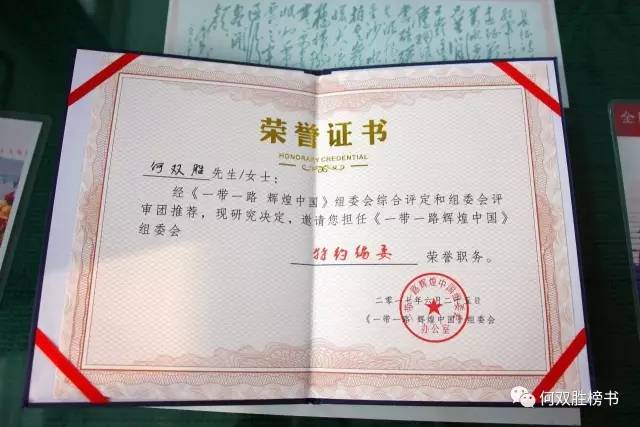 何双胜是位书法爱好者,自幼跟随祖父、父亲学习书法的他通过不断地临帖、读帖以及与其他书法家交流经验,很快他的书法作品得到了很多专业人士的认可。2014年7月份,何双胜成为中国榜书家协会(现中国社会艺术协会榜书委员会)会员;同年10月,他的榜书作品“好学”被韩国首尔大学收录于《中韩近代史教程》;部分作品被大型画传《中国艺术大家》、《一带一路辉煌中国》特邀收录。