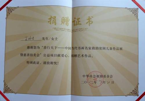 王冰专捐赠书法拍卖救助贫困儿童证书