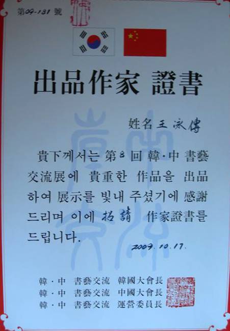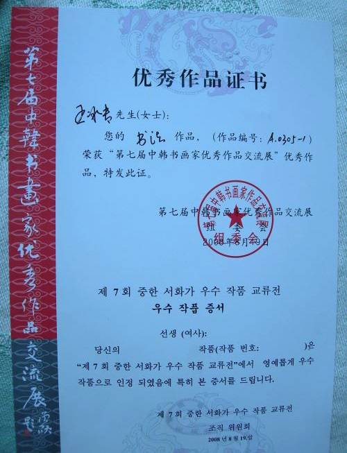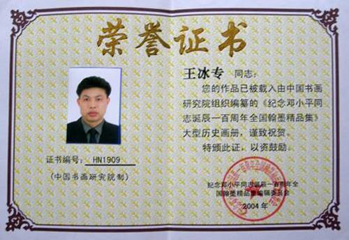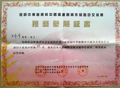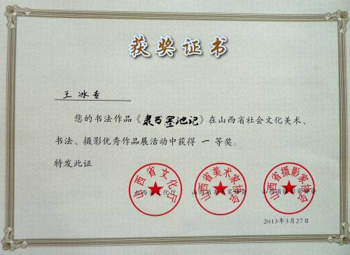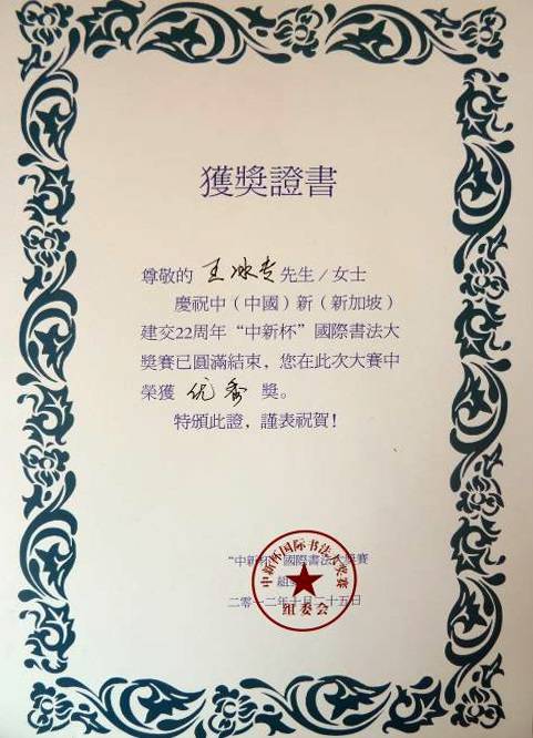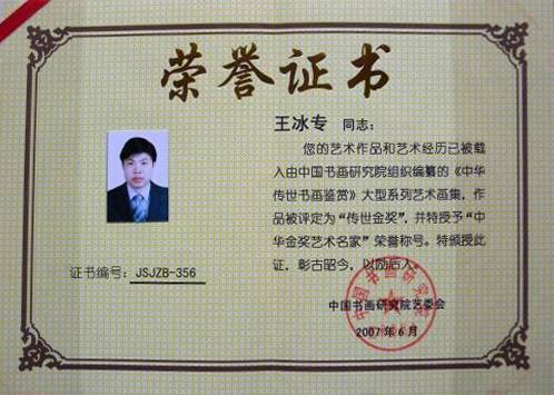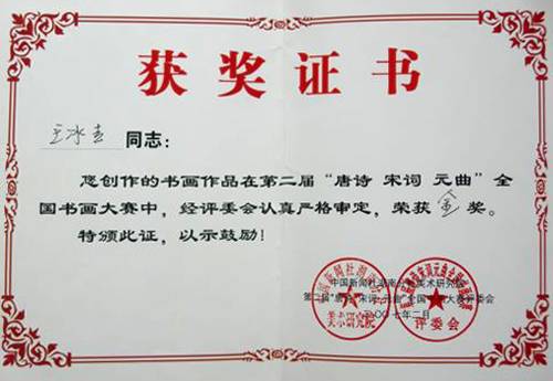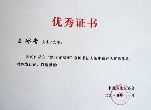 王冰专获全国祭侄文稿杯书法优秀(最高)获