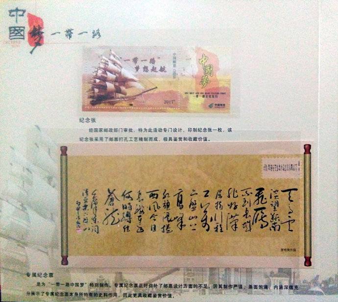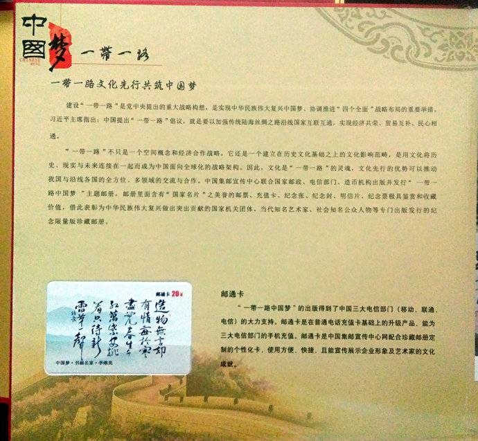 2017年5月18日,是个美好和吉祥的日子。在这个春风拂面、鲜花盛开、春意盎然的日子里,李维亮先生的十几幅字画被中国邮政宣传中心、中国邮品研发组委会选中,并集印成邮票、明信片、专属纪念票、纪念章、纪念币、纪念封、邮通充值卡及一带一路“中国梦”限量版珍藏邮册,在全国发行。
