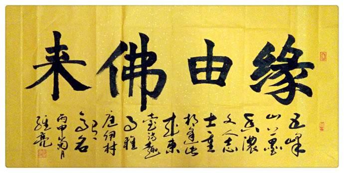 另外,我在网上一查资料,发现我和沙门释觉一大师同龄,又同一年开始练得书法,这就又有了奇缘。再者,查看五台山的旅游资料,五台山是文殊菩萨的道场,我的一个很重要的日期又正是文殊菩萨的生日日期,这就奇上加奇了。因此,感慨非凡,浮想联翩,感叹人生奇妙。遂赋诗一首,名曰《缘由佛来》。