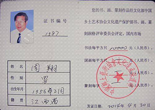 周翔书法作品润格证书