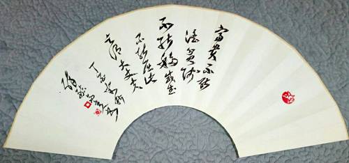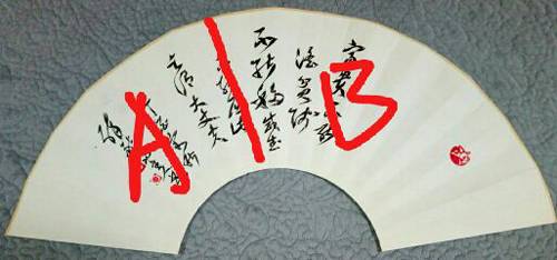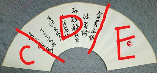 创作意图:扇面整体被文字部分分割为A,B。A:B=5:8。C+E=D。5:8以求美感。C十E=D以求平衡。其它幅式可以类推。